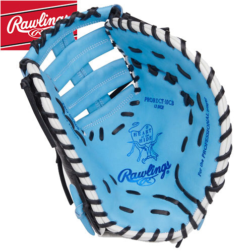 Scoop 'em all with the 13-inch Heart of the Hide first base mitt, a beautiful glove with a Columbia blue and black colorway. Additionally, the columbia blue on white Rawlings patch and columbia blue Oval-R are a nice touch to add some flare to the mitt.